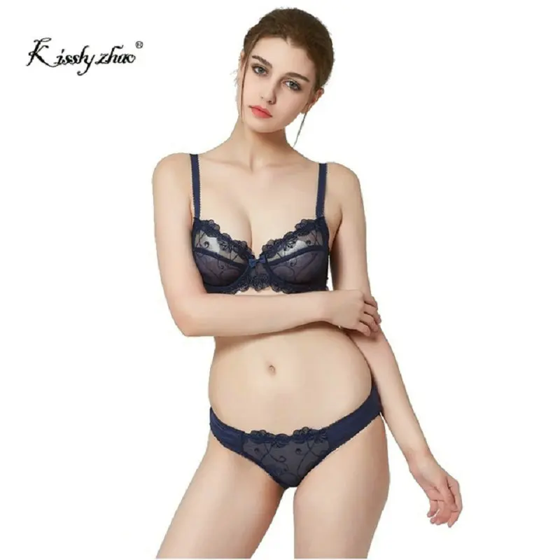 Hot Sale Women Ultra-thin Underwear Sexy Lace 1/2 Cup Bra Set Hollow Embroidery Half Cup Push Up Brassiere Plus Size Bras Set