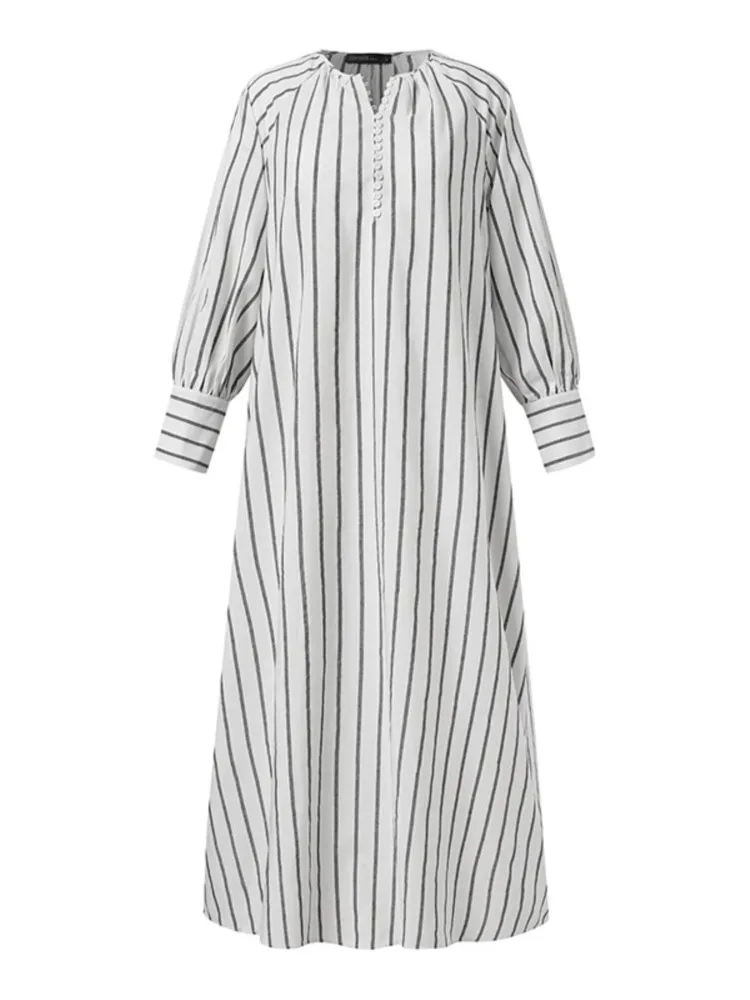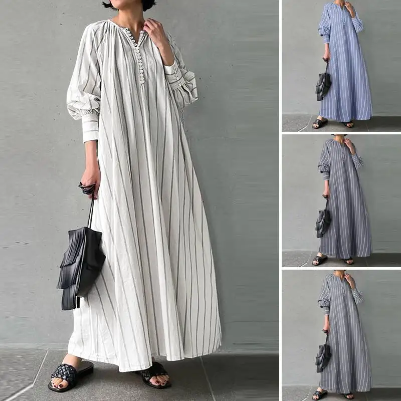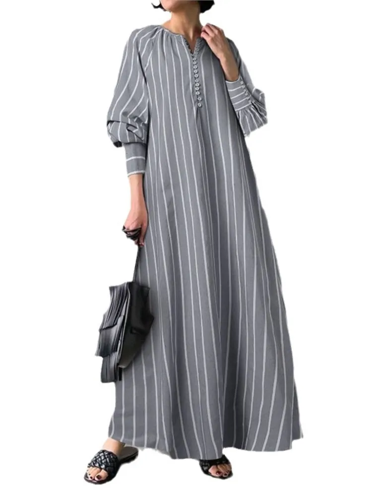 2023 Cotton Linen Printed Dress Long Sleeve Round Neck Casual Loose Maxi A-line Dresses For Women Commuting Vestidos Para Mujer