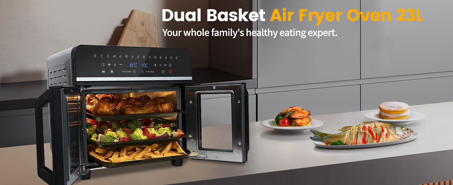 - Dual zone championship: our double door hot air fryer offers two temperature zones. Thanks to our advanced technology, you can synchronise cooking times and settings in the zones. So every serving of your meal is ready at the same time and you can enjoy fresh, hot food. Whether it’s a main dish or side dishes, adjust the preparation precisely and cook everything at the same time – the true essence of an Airfryer mini oven combination.