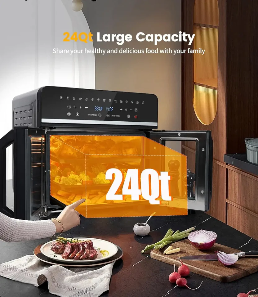 - All-in-one versatility: this kitchen miracle is a hot air fryer, toaster, oven, grill, rotisserie, dehydrator, roasting dish, pizza oven and warmer in one and offers you everything you need in a single device.