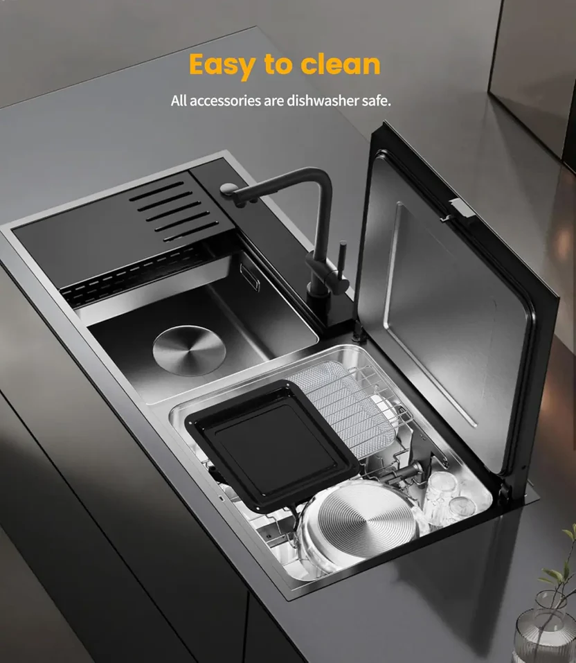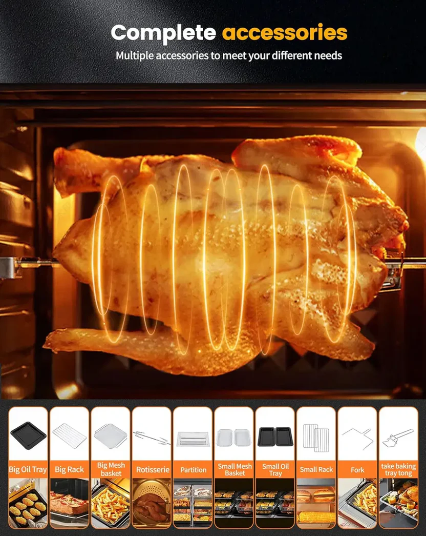 - Full accessories: Equipped with 11 luxury accessories, it offers you more cooking options than any other mini oven. Accessories include: 3 roasting racks (1 large and 2 small), 3 baking trays (1 large and 2 small), 3 rotating roasting baskets (1 large and 2 small), a fine mesh grilling basket, a divider, and a deluxe kitchen set.