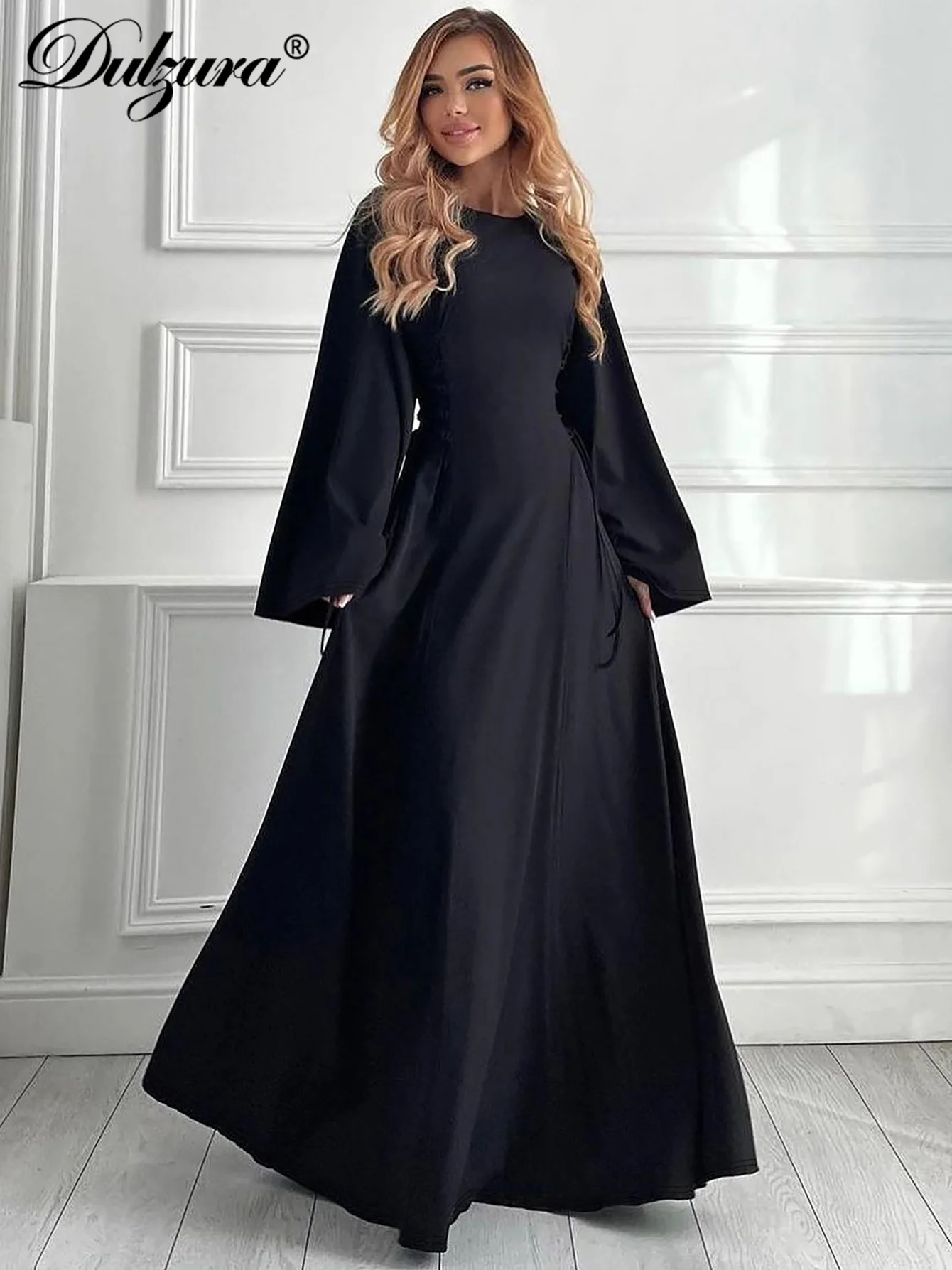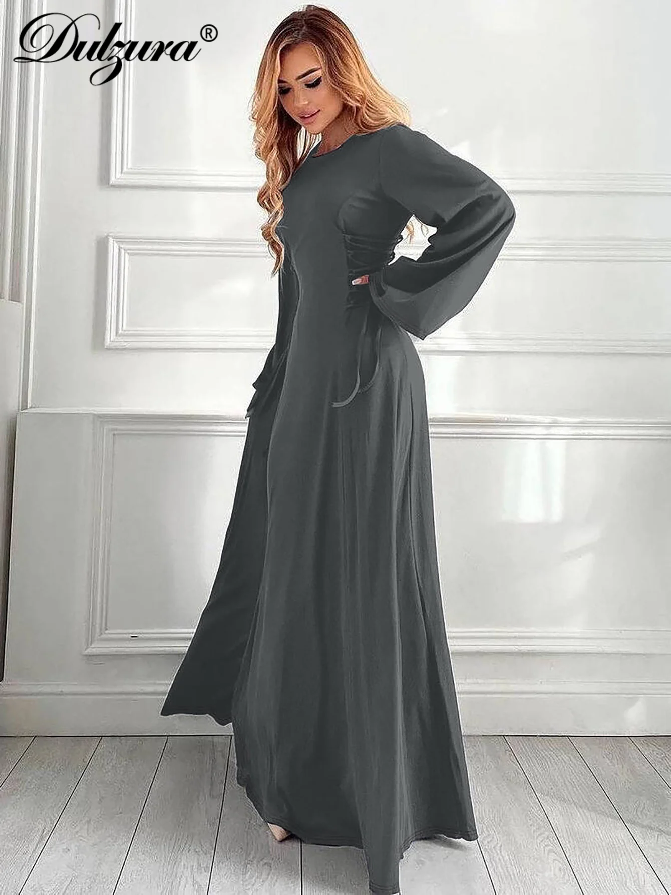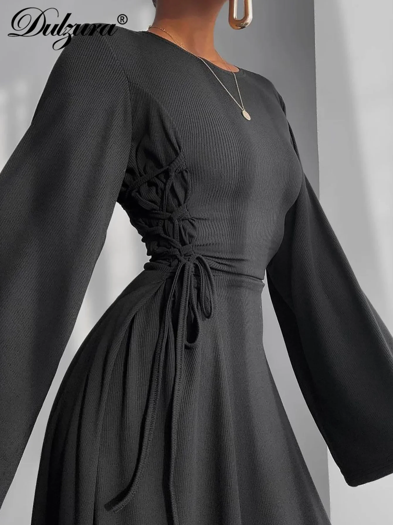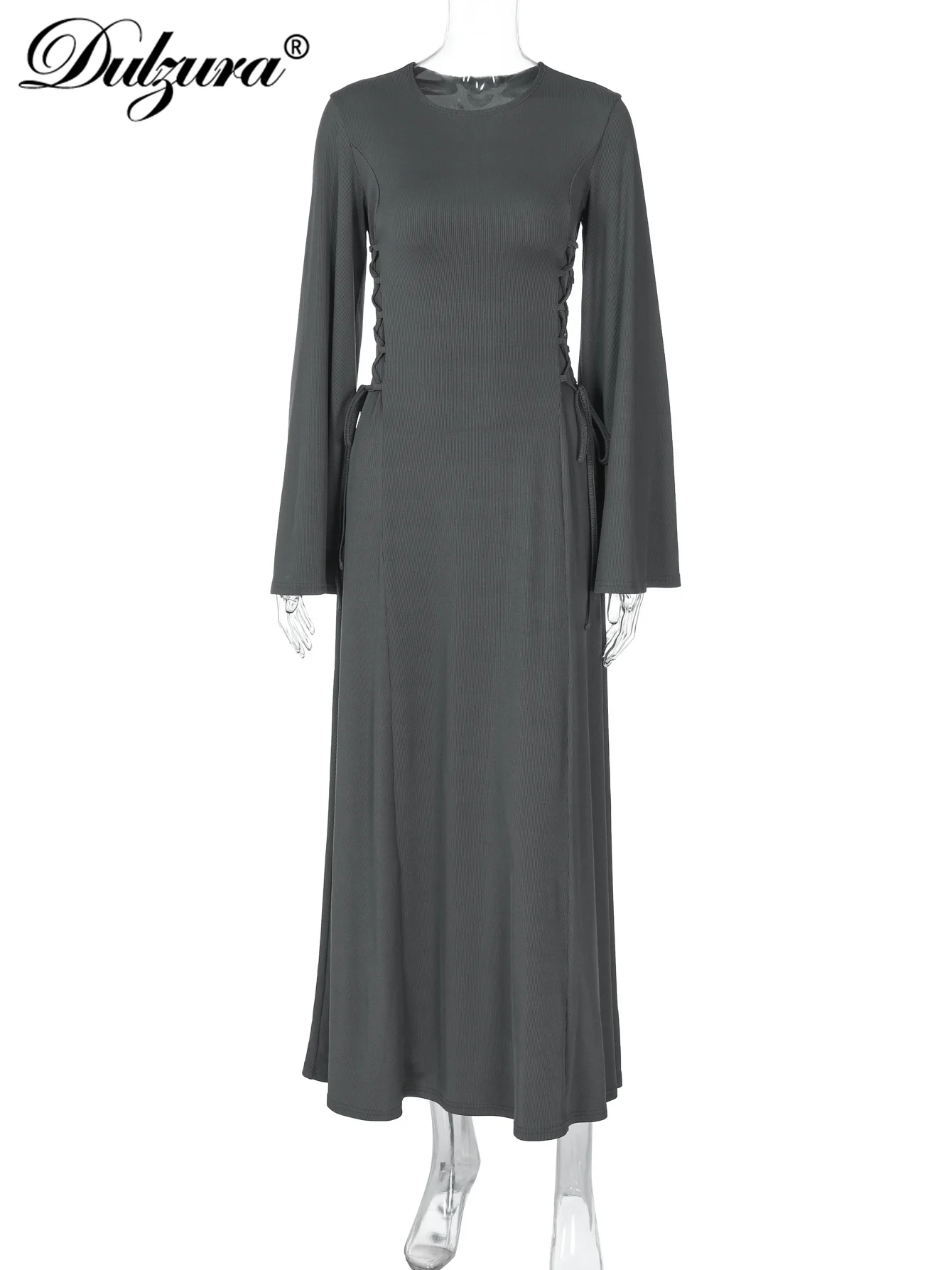 Dulzura Ribbed Long Bell Sleeves Lace Up Slim Maxi Dress Solid Elegant Casual Long Dress Women’S Party Club Streetwear Autumn