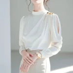 Elegant Hollow Out White Blouse Spring Autumn New Long Sleeve Solid Button Patchwork Fashion Blouse Temperament Women Clothing
