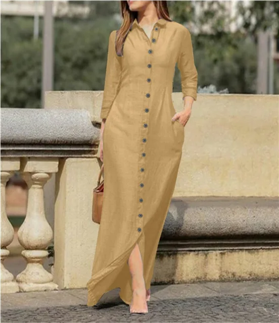 Elegant Long Dress For Women Spring Autumn Long Sleeve Solid Color Cotton And Linen Shirt Dresses Casual Button Dress Robe Femme