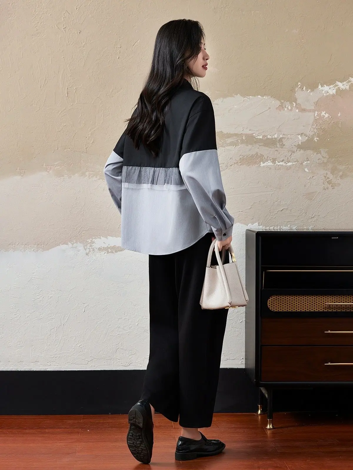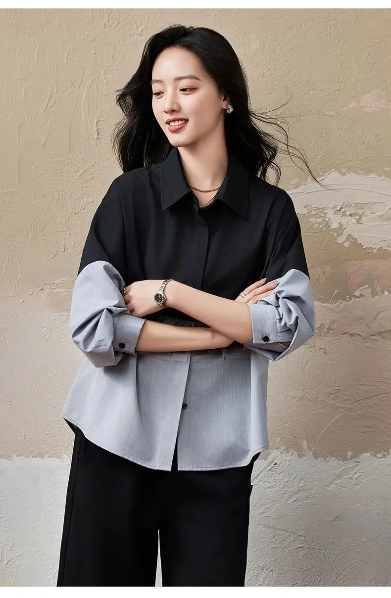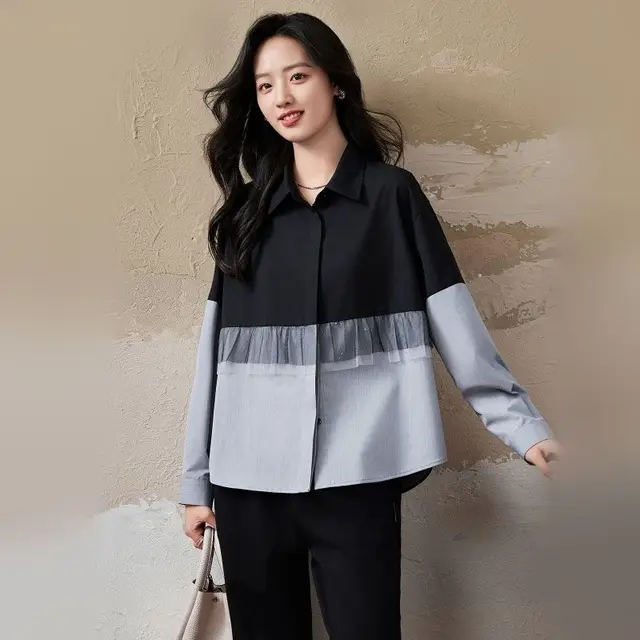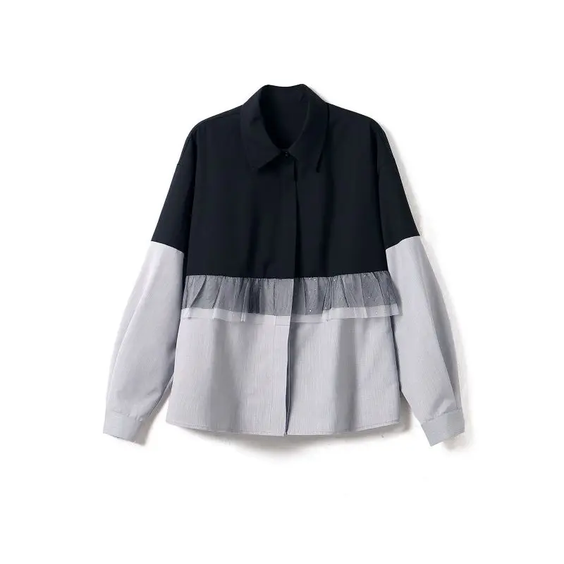 Fashionable Korean Style Slimming and Versatile Contrasting Mesh Stitching Fake Two-piece Shirt for Women