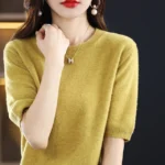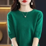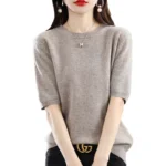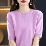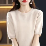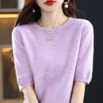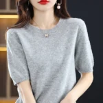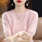 Female spring and summer 100% pure wool short-sleeved Women’s sweater T-shirt simple Round neck knitted pullover loose top base