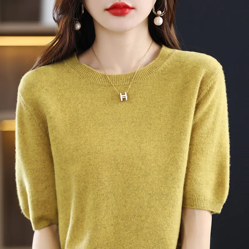 Female spring and summer 100% pure wool short-sleeved Women’s sweater T-shirt simple Round neck knitted pullover loose top base