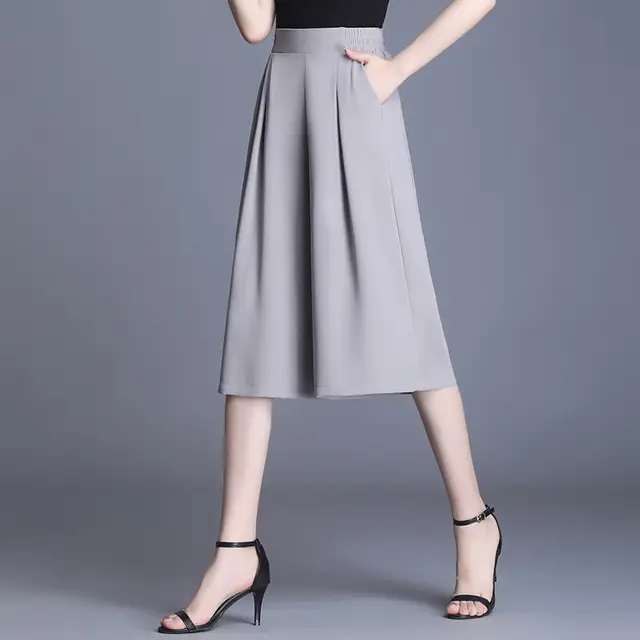 Summer New Fashion Casual Loose Chiffon Wide Leg Capris Women’s Solid Elastic High Waist Pockets Thin Breathable Straight Pants