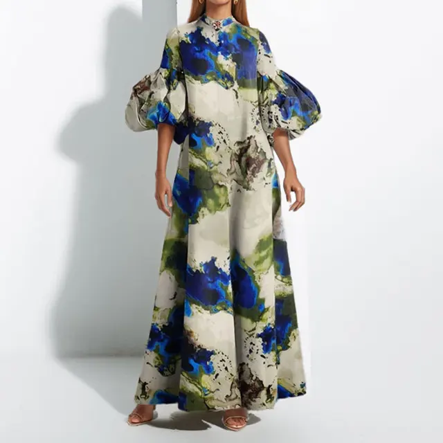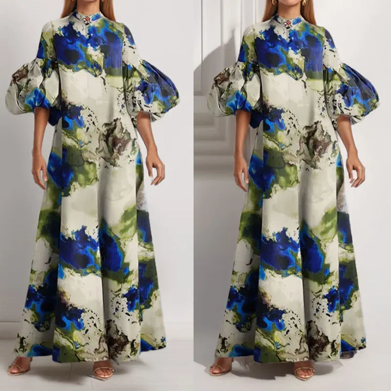 Women’s Printed Maxi Dress Elegant Ladies Lantern Sleeve Loose Long Dress Summer New Evening Party Dress For Women