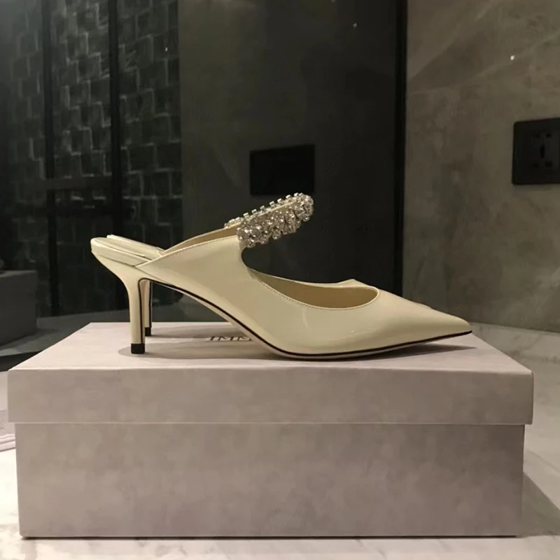 Women's Summer Sandals Pointed Toe Mules Rhinestone Patent Leather Pump With Stiletto Pumps Semi-Slip Toe Half Drag Flat